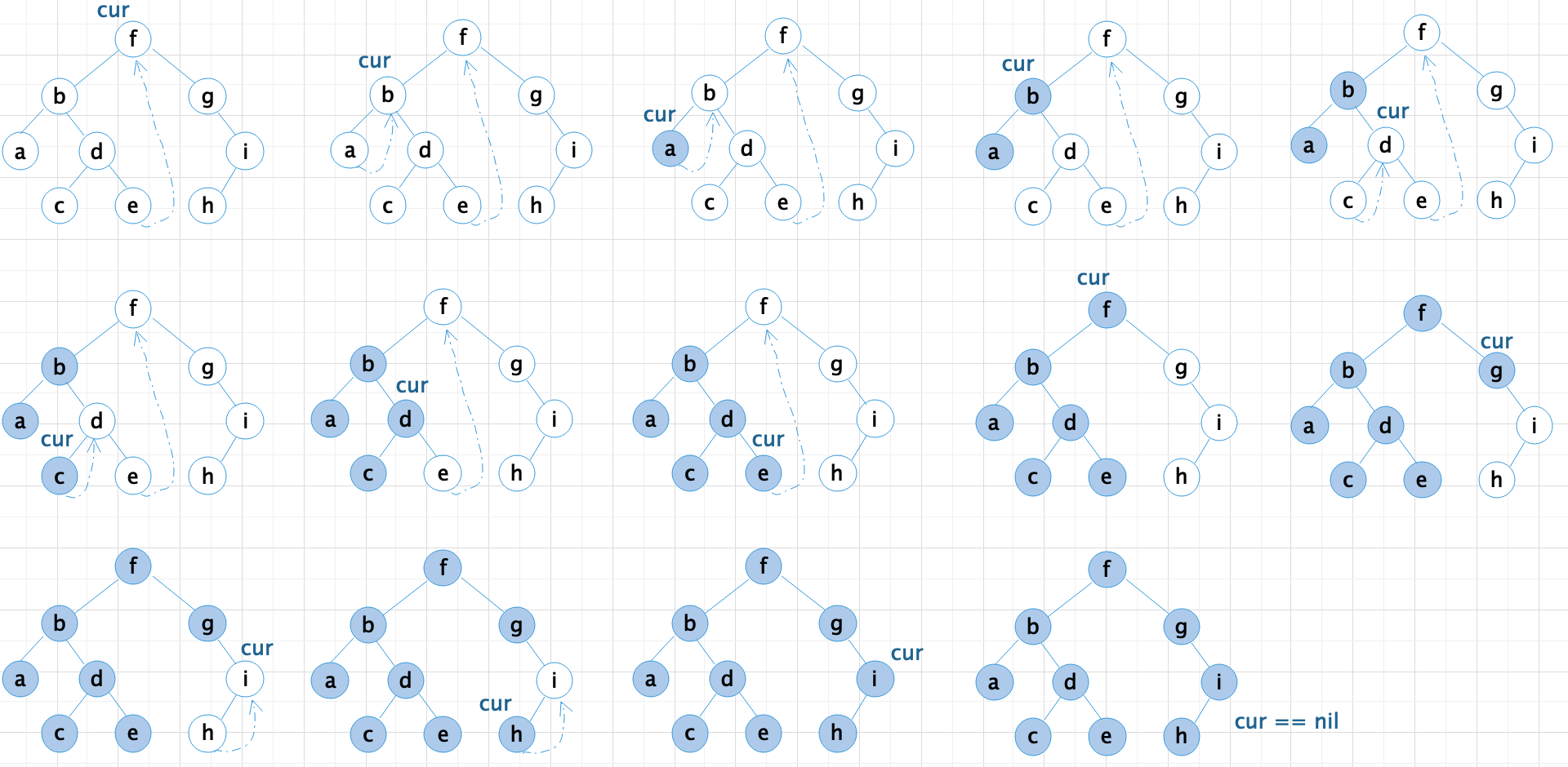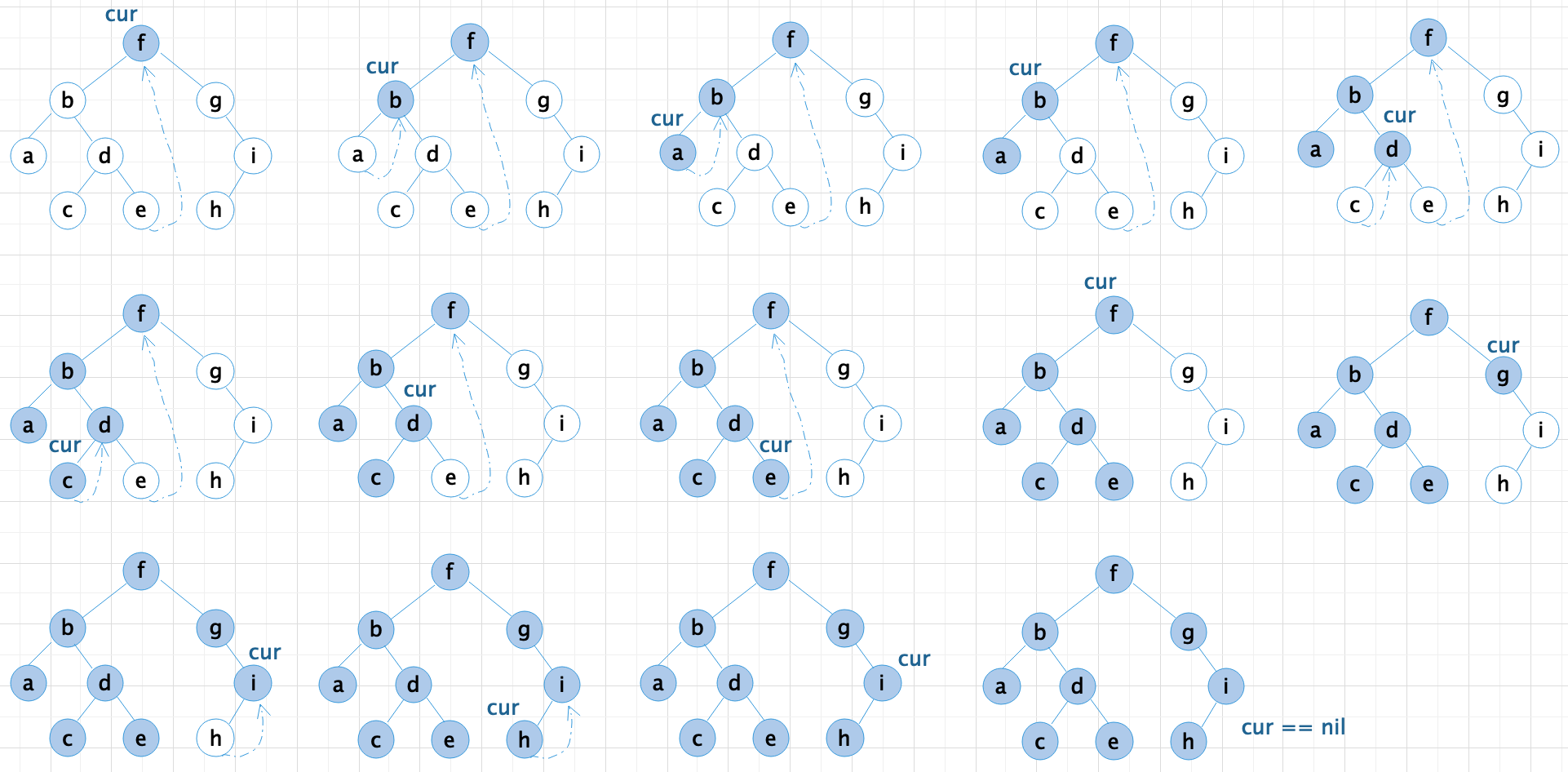2.2 由于 2.1 的原因,node 的右指针可能是 cur,如果是 cur,说明 cur 的左子树已经遍历完成,